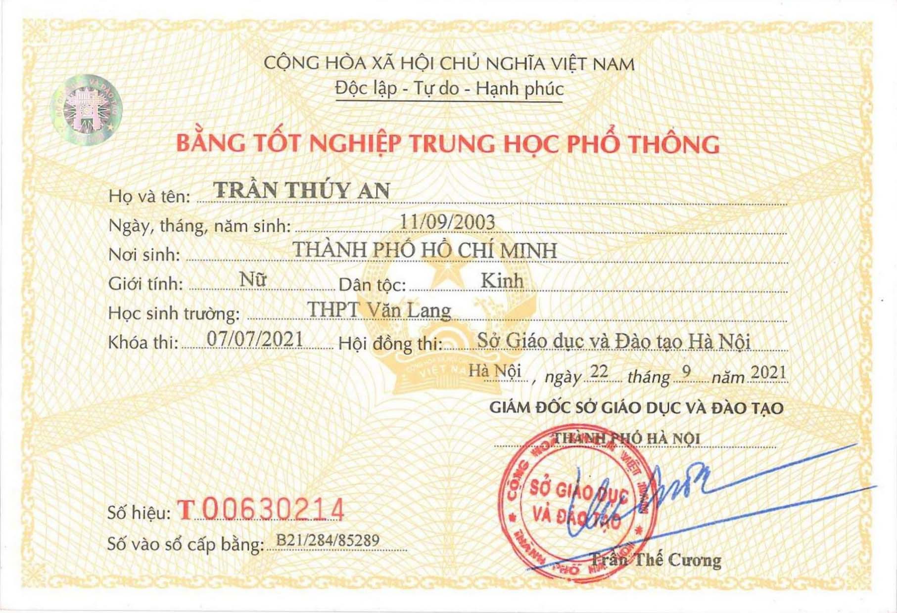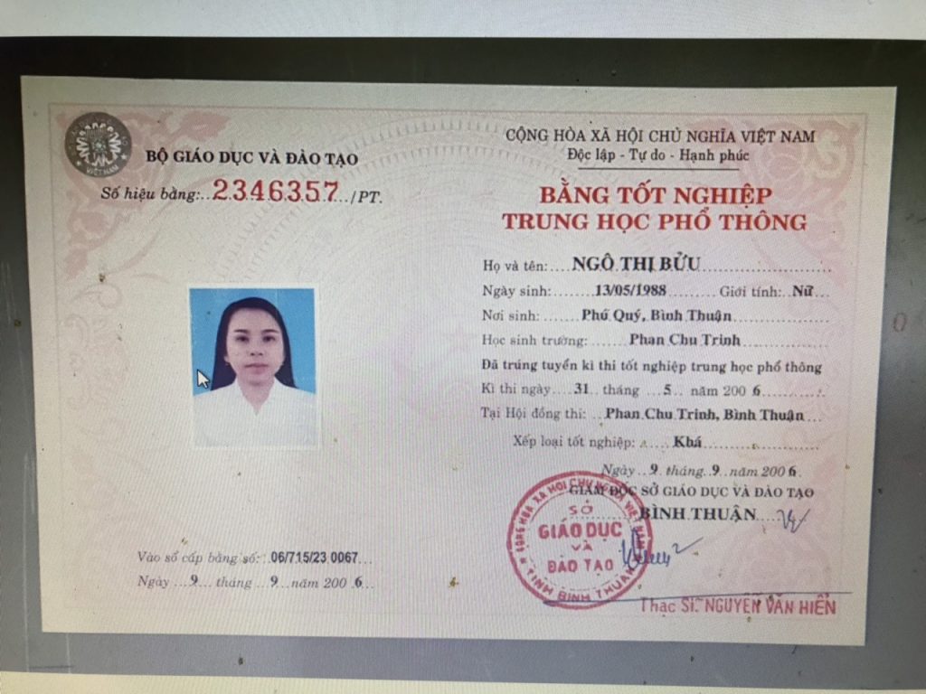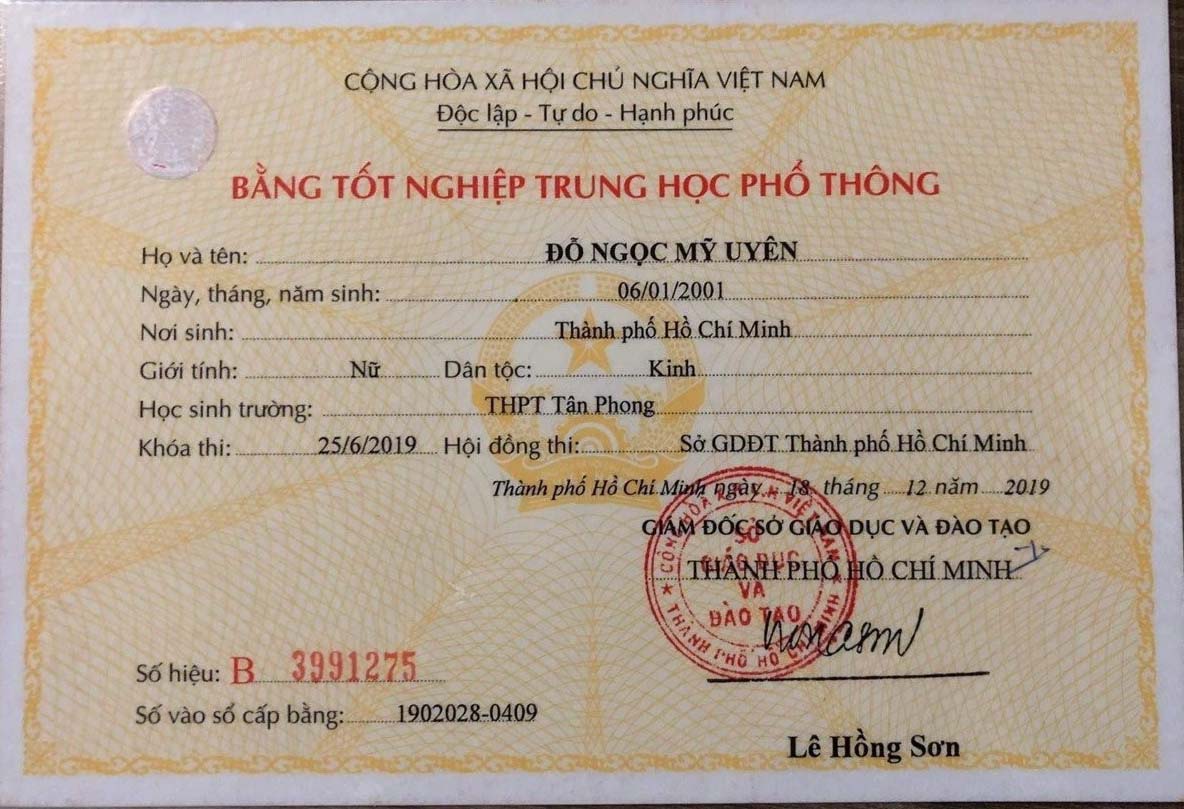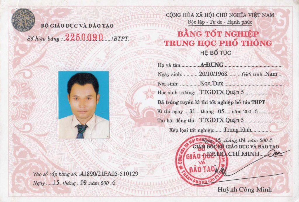 Bằng THPT – Bằng Cấp 3 Bình Thuận được làm từ phôi thật, tem thật của các trường. Do vậy, chúng tôi đảm bảo chất lượng như bằng thật chất lượng chính xác 100%. Bao soi, bao công chứng trên toàn quốc